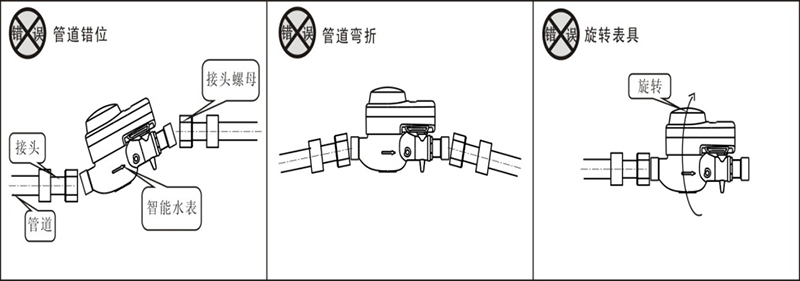 將表接頭套入接頭螺母后安裝到管道上,然后扭轉接頭螺母將水表安裝到管道上,保持水表讀數度盤水平向上,水表與管道連接時不應受過大的折彎力,以免損壞水表接口斷裂。禁止出現如下圖所示的安裝方式: